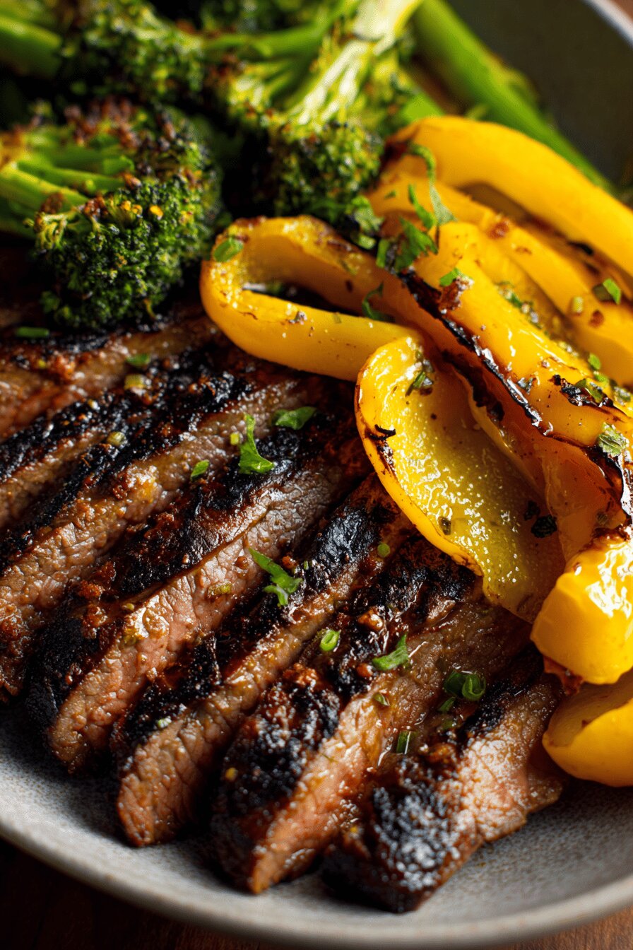 Flank steak grilled with charred yellow and orange peppers. Broccoli tossed with garlic and smoky chili paste. A simple combo for four, no gluten, dairy, nuts, or eggs. Uses slightly less olive oil and swaps harissa for chipotle powder and garlic for shallots. Peppers are blanched instead of just charred, adds subtle softness. The steak rests for juicier slices. Serve with steamed quinoa or couscous instead of rice. Cook times adjusted by 2-3 minutes, peppers get a double char for more crunch.