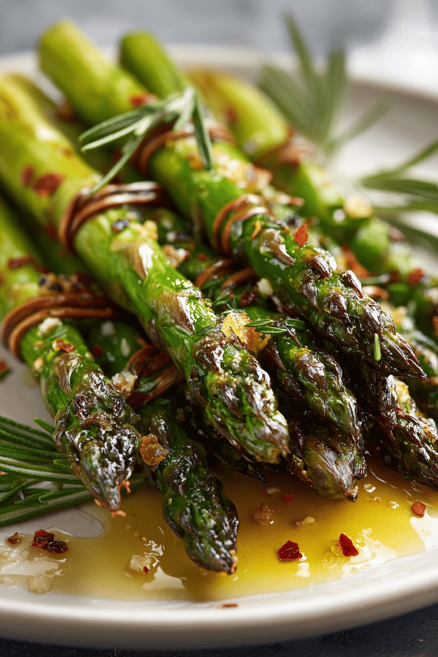 - 3. Brush bundles generously with garlic olive oil. The oil pools in the crevices, smells herbaceous and pungent. Season with a sprinkle of coarse salt and a crack or two of pepper. Red chili flakes? Goes well if you want a whisper of heat, but optional. Resting here helps oil soak into asparagus fibrous exterior; don’t skip.