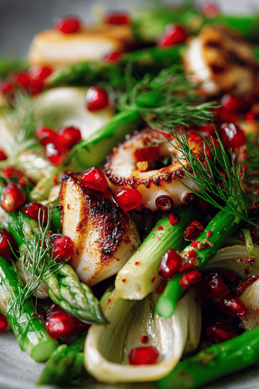 Using frozen cooked octopus is practical — saves long cooking and tenderizing. Thaw in fridge for several hours or overnight. Pat dry before oiling. Asparagus trimmed thick for grilling, keeps crunch. Fennel bulb sliced very thin, mandoline best or very sharp knife. Pomegranate adds sweet crunch; fresh seeds preferred over juice concentrate. Ground fennel seeds bring anise aroma, but don’t overdo. If absent, anise seed or even mild star anise powder can substitute sparingly. Maple syrup replaces honey for vegan option, balances lemon acidity nicely. Fresh dill and fennel leaves (fronds) chopped small; add brightness and herbaceous lift. Olive oil quality matters, use good extra virgin variety. All ingredients measured to keep dressing and grilling balanced — generous but not overwhelming.