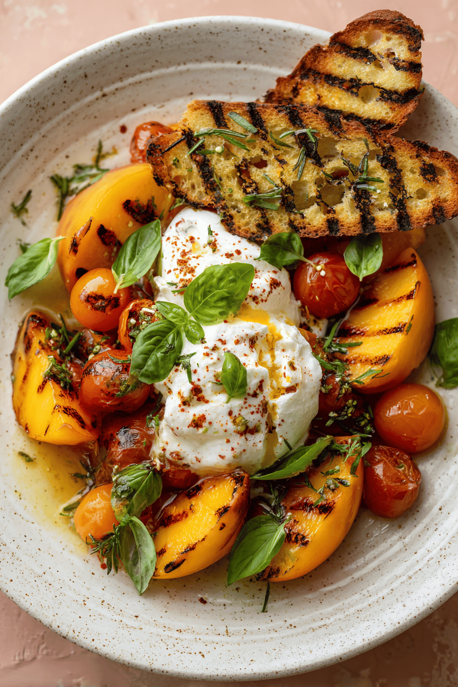 - 💡 Grill peaches direct heat. Brush with olive oil evenly so grilling caramelizes sugars without mush. Listen for low crackle, flip fast to avoid juices running. 4-6 minutes total usually. Skin chars lightly signals close. Too much juice means overcooked, slips into mush territory, ruins contrast. Pick peaches ripe but firm, never rock hard or mushy. Texture key here. Burrata sits on plate while fruits are warm; cool cheese dulls flavor.