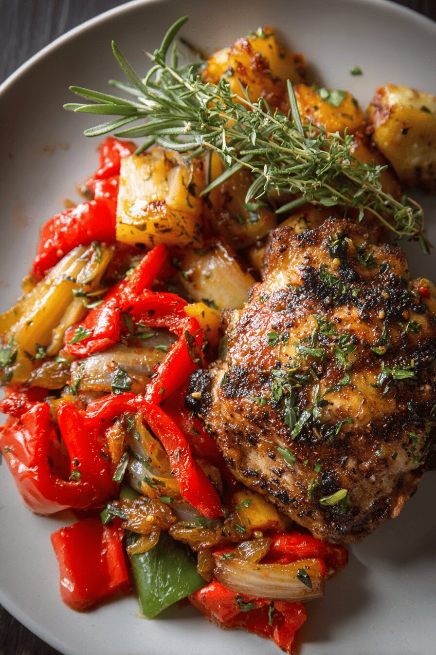 - 💡 Scaling quantities? Drop peppers about 15%, chicken thighs about 25% from original. Oil scaling matters—too little burns, too much soggy. Adjust proportionally for browning efficiency. Parsley optional—adds fresh color clear brightness. Grilling indoors? Use oven at 230C on rack, broil last three minutes for skin crisp. Watch timing carefully; texture cues more reliable than clock.