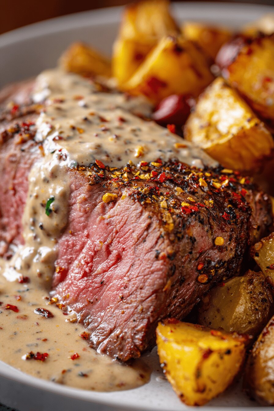 Sirloin beef roast tied to keep shape during grilling, about 1 ½ pounds - firm but not dense. Trussing essential for even cooking and neat slices. Coarse salt preferred for flavor and crust effect. Spice combo swapped coriander seeds for cumin seeds replacing one original spice, a twist for earthier aroma. Peppercorns freshly cracked deliver bite. Chili flakes gently crushed for heat layers but milder than cayenne. Olive oil coats and prevents sticking on grill, also helps spices adhere. Shallot replacement over onion for nuanced, sweeter flavor in sauce. Chicken stock chosen over beef for balanced depth without overpowering sauce richness. Added smoked paprika for subtle smoky note in sauce, pairs with grill char. Butter for richness; flour to thicken sauce, cream softens pepper sharpness. Worcestershire tang layers umami. Salt adjusted at end for control. Use fresh cream 35% fat for best mouthfeel, or substitute half-and-half for lighter version, sauce thickness adjusts accordingly. Sauce pepper cracked coarsely for texture and sharp bursts. Spice crushing done just before application to preserve oils and aroma. Heat control key to roast doneness; too hot and spice crust burns. Resting time adjusted to 12 minutes for better juice redistribution. Serve with roasted potatoes and Brussels sprouts to cut richness, add earth and slight bitterness. Final dish gluten inclusive due to flour in sauce.