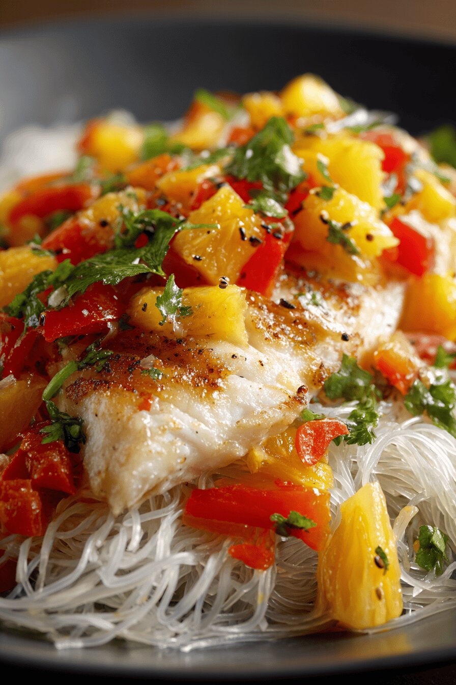 - Add hot vermicelli to salsa mixture, toss to coat fully. Serve vermicelli nest on plates, place fish atop gently. Sprinkle remaining herbs. Drizzle olive oil to finish. Serve immediately to preserve warm contrast.