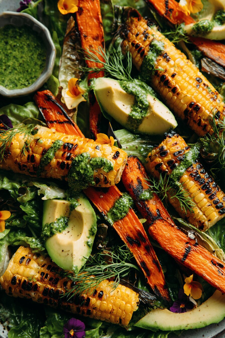 Chimichurri made first, mixing herbs with oil and acid then sweetener, salt. Pepper added fresh later to not overwhelm herbaceousness. Grill preparation critical—high heat and oiled grates prevent sticking and encourage charred flavor. Rotate veggies frequently for even caramelization, avoid burning. Cooling before shelling corn and slicing carrots avoids loss of juice and burning fingers. Toss veggies warm but not hot with half sauce to marry flavors without wilting lettuce. Save rest of chimichurri for last-minute brightness. Plating with avocado last maintains shape and prevents mush. Edible flowers sprinkled carefully. Serve immediately to prevent lettuce sogginess. Timing adjusted ±5% for balance of tenderness and char.