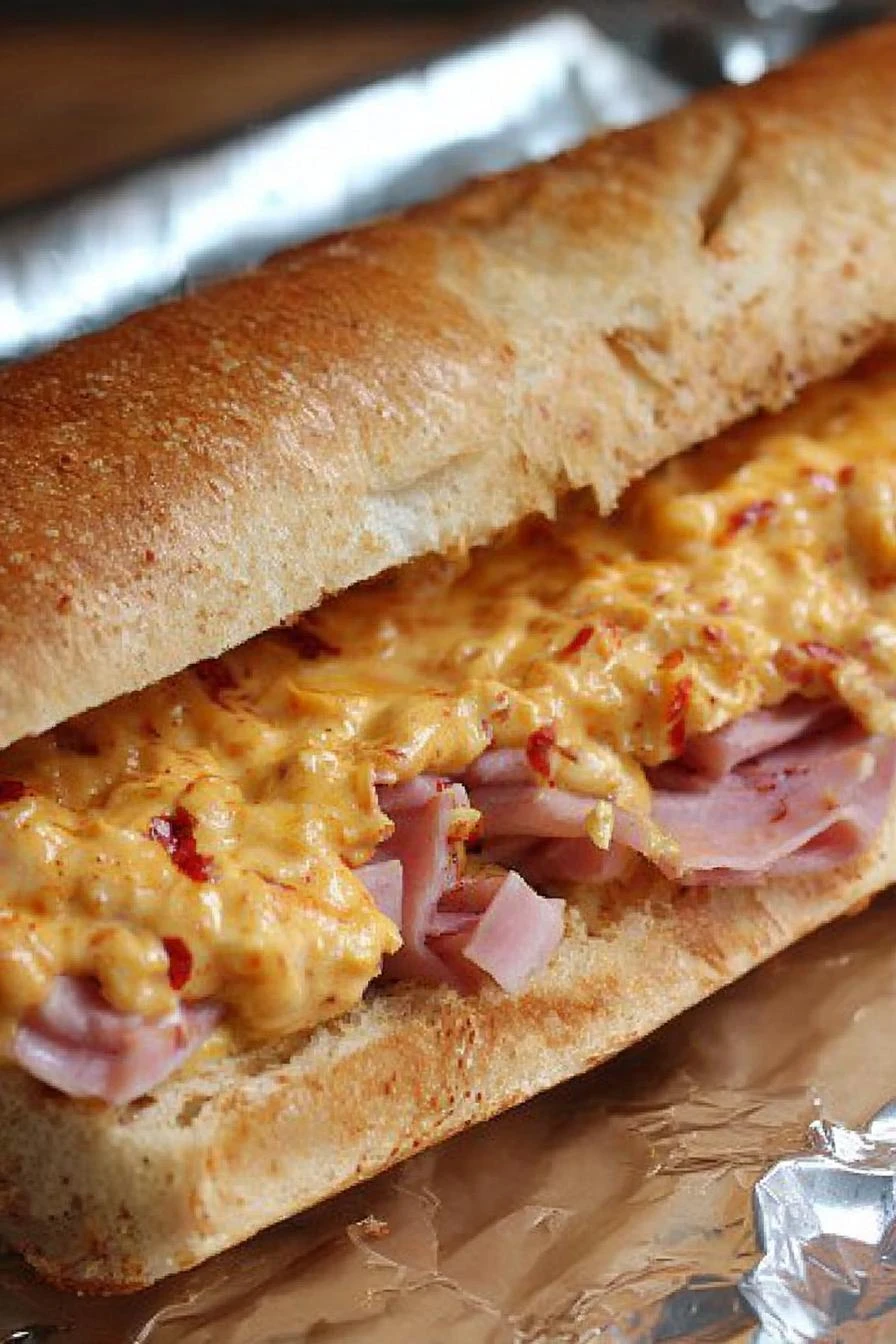 Cut the bread lengthwise but keep it whole. Spread pimiento cheese on one half, layer thick ham on the other, press together, wrap in foil, bake 18 minutes. It’s done when the foil puffs and you hear a faint sizzle inside. That’s it. That’s the sandwich.