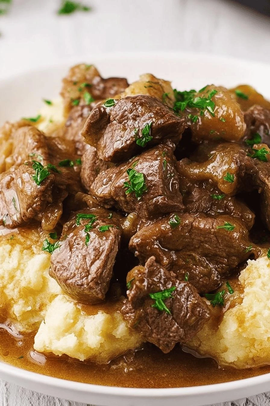 Two and a half pounds of beef stew meat. Cubed. Don’t buy pre-cut if you can avoid it — ends taste dry sometimes. Three tablespoons olive oil. Split it up. Two batches of searing. One medium onion. Diced. Size doesn’t have to be perfect. Two and a quarter cups beef broth. Stock works too. They’re basically the same. Onion soup mix. One envelope. Easier than building flavor from scratch. Works. Tamari sauce instead of Worcestershire. Less sharp. More umami. Different thing entirely and better for this. Half teaspoon salt. Maybe more — taste it after. Quarter teaspoon black pepper. Freshly ground. Not the pre-ground stuff. One bay leaf. Just one. Two is too much. Two tablespoons cornstarch mixed with cold water. Makes it thick. Fresh parsley for the top. Green. Cuts the richness.