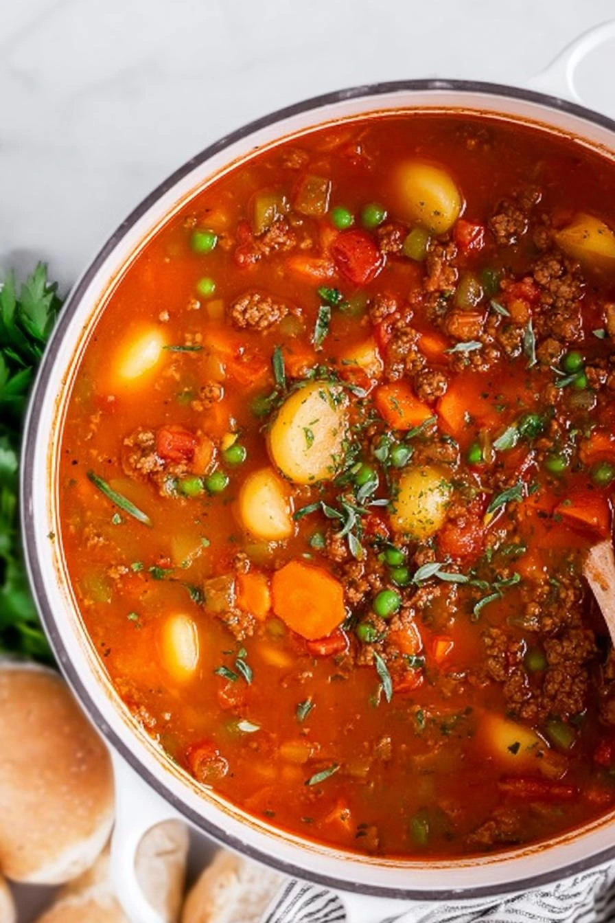 Toss ground beef and onion into a hot pot. Listen for the sizzle. That’s when you know the heat’s right. Break it apart as it browns—deep mahogany, not pale. Vegetables go soft around the same time. Eight to ten minutes, maybe eleven if your stove runs cool.