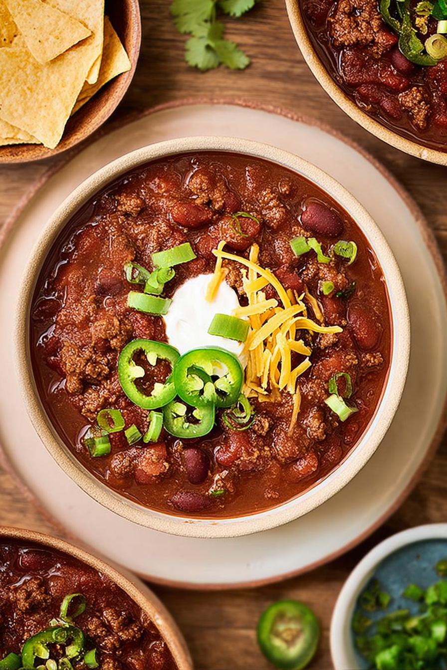 - Serve in bowls topped with a handful of shredded cheddar for melting richness, a dollop of sour cream for cool tang, and chopped green onions for bite and color contrast.