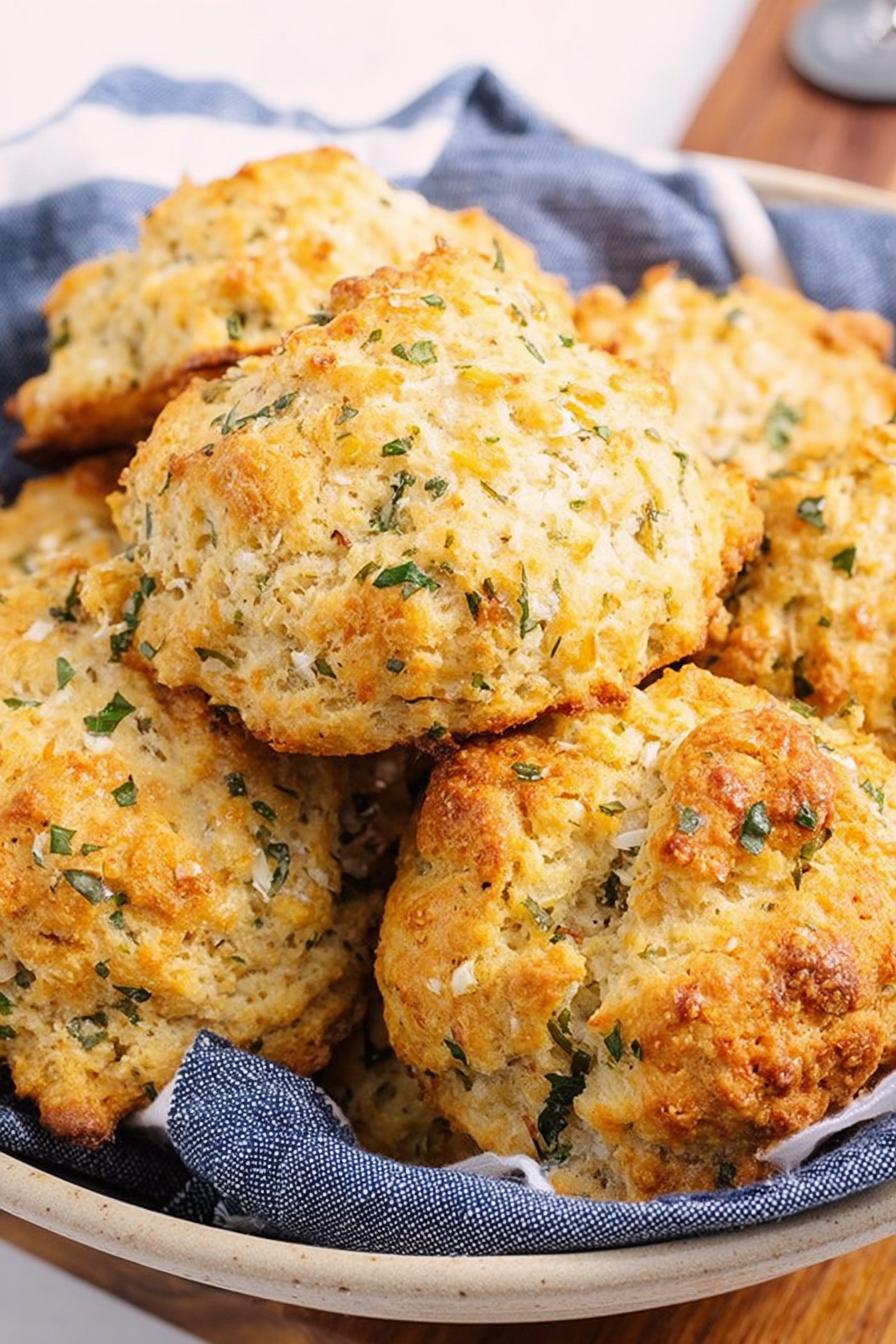 Flaky biscuits with fresh herbs and sharp cheese. Nothing fancy. Just straight to the point with a loose dough dropped by spoonfuls—no rolling, no fuss. I’ve done rounds tweaking liquids and fats, settling on vegetable oil for tender crumb without greasiness of too much butter. Sharp white cheddar mixed with Parmesan builds a clean cheesy hit without overpowering herbaceous spark. Herbs vary with season or mood—thyme, chives, rosemary. Garlic powder is my shortcut punch—if fresh garlic, bring it down to avoid raw harshness. Oven hits 395°F, close enough to 400 but cuts risk of burnt bottoms. Watch golden tops and aroma. Brush with melted butter after baking for shiny, buttery kiss on crust. Great side for soups, snacks, or just snacking on the fly. Throw anything in, adapt at whim.