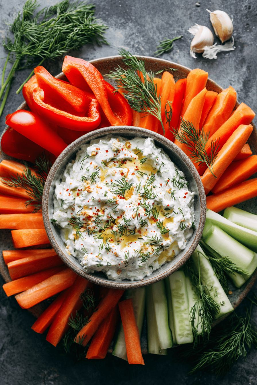 - Visual: dip looks fresh, glossy; herbs vivid; veggies bright and firm.