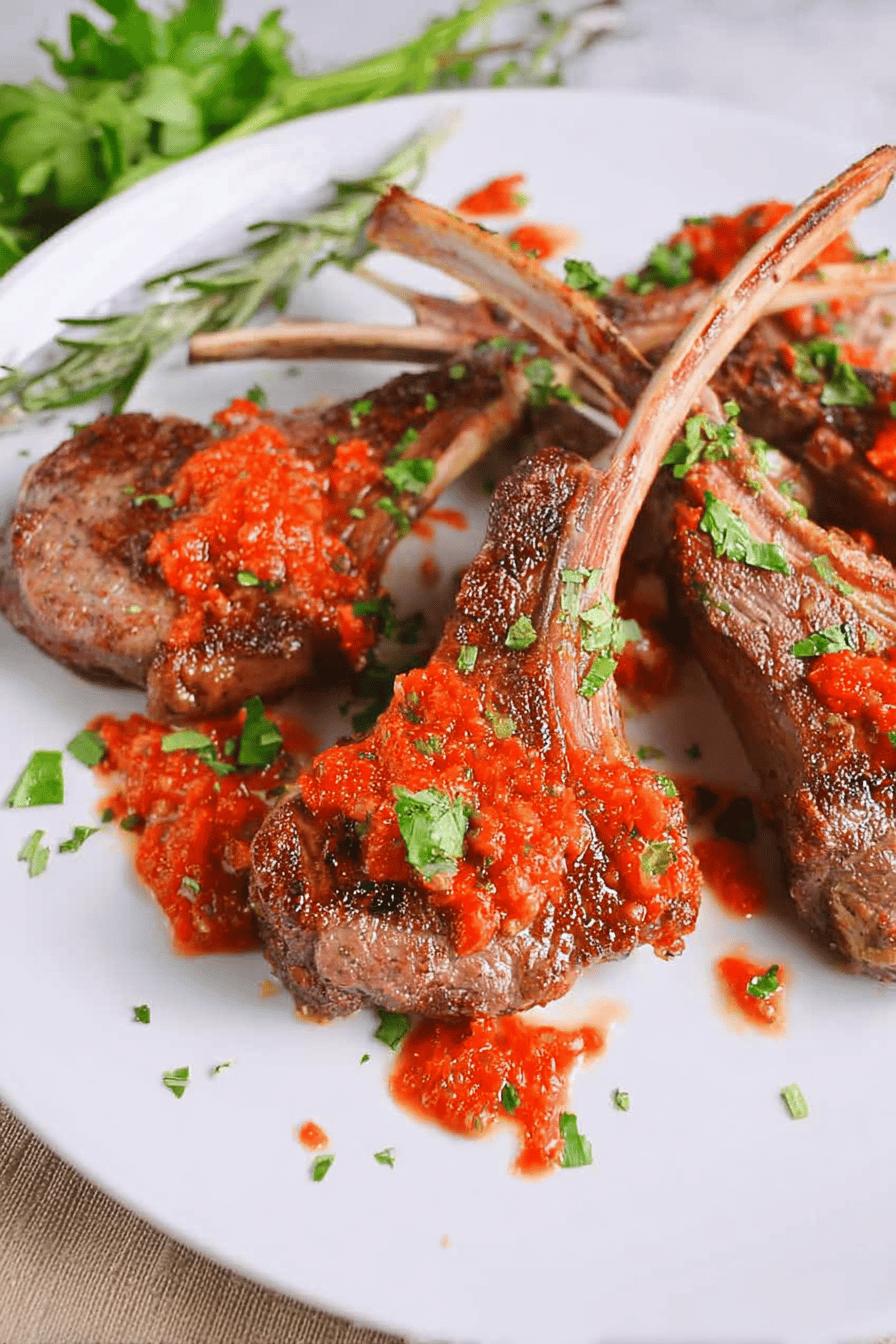 Heat your pan until it just smokes and oil shimmers. Cast iron retains heat better but stainless steel will do if coated properly. Timing isn’t strict minutes—listen for even sizzle, edges crisp, meat firming slightly under touch. Avoid moving chops too soon; patience rewards with crust. Flip once, let crust set on other side. When done, transfer immediately to low oven or warming drawer to hold heat without overcooking. Keep moisture in the meat. Crowding the pan kills sear; do batches. Romesco pulsing stops before smooth keeps a rustic texture, good balance between chew and spread. If your lamb chops vary thick, adapt cook time; test doneness by gentle press. Thick chops can handle slightly longer; thin thin quick quick. Resting lamb is non-negotiable; muscles relax, juice returns to center. This elevates texture from dry to succulent. If garlic harsh, roast it longer or remove clove skins for sweetness. Sauce holds in fridge several days; ideal for make-ahead hustle. Practice makes intuitive timing.
