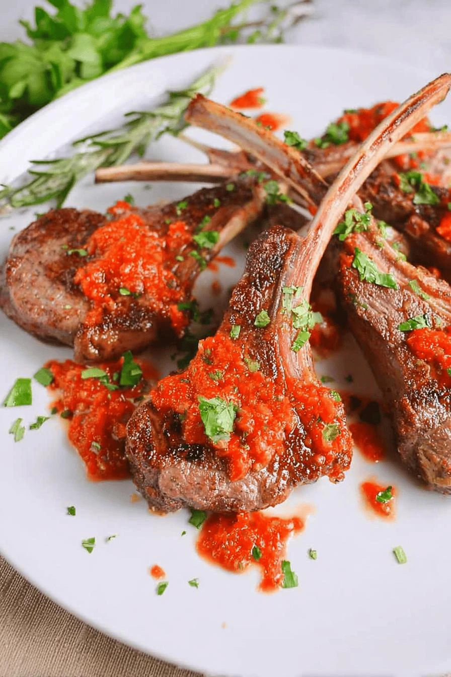 - Plate chops with generous spoon of romesco. Watch the contrast—deep crimson sauce on browned lamb with herb flecks.