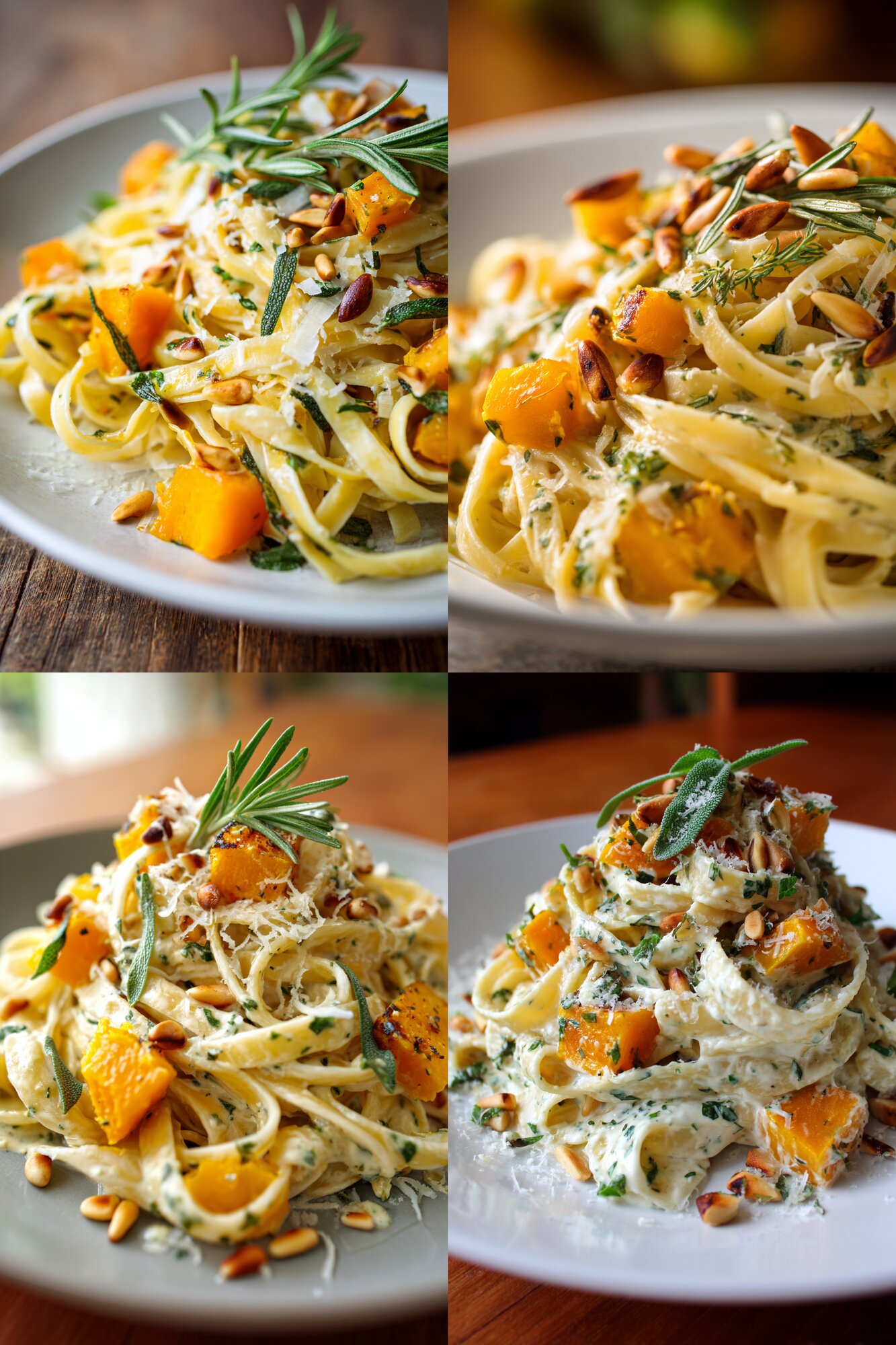 Oven temp dropped slightly for even roasting. Time cut down 2-3 minutes to retain squash bite and prevent dryness. Garlic roasted alongside to soften thoroughly, then pressed and pureed to integrate smoothly into cream. Sage removed post-roasting to avoid bitterness. Cream simmered briefly with herbs then infused off heat 6 minutes instead of 5 to extract deeper essence. Pasta boiled shorter than package to maintain firm texture. Stirring cream and pasta mix over heat until sauce thickens ensures coating without drying out. Cheese stirred in gradually to melt evenly. Lemon zest added last step prevents bitterness forming. Pine nuts toasted separately then folded in last for crunchy intactness. Herbs split, half folded in and half sprinkled atop to keep vivid color and fresh flavor alive at service.