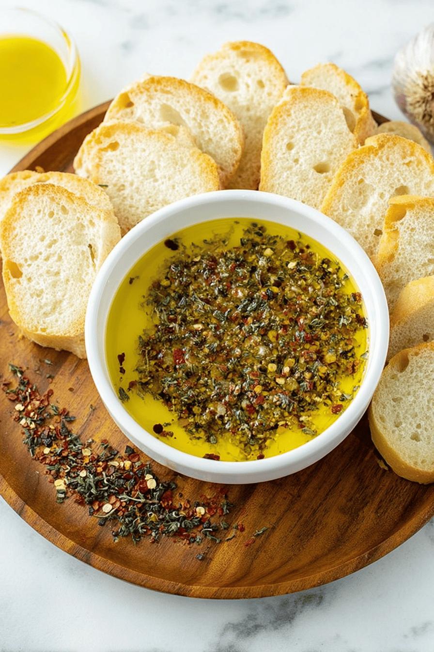 - 💡 Mix timing key—fresh garlic grating triggers pungent aroma immediately. Add oil slowly to spice mound; pour gently so herbs bloom scent first before submerged. Refrigerate leftover infused oil separately; oil clouds but flavor holds. Bring back to room temp before dipping; cold oil dulls sensory punch. Bread texture matters; chewy crust catches flavor, soft crumb soaks oil and herbs. Toast ciabatta or sourdough boule for contrast. Mix balance tuned more to garlic punch than long oil soak; sharpness dims if wait too long.