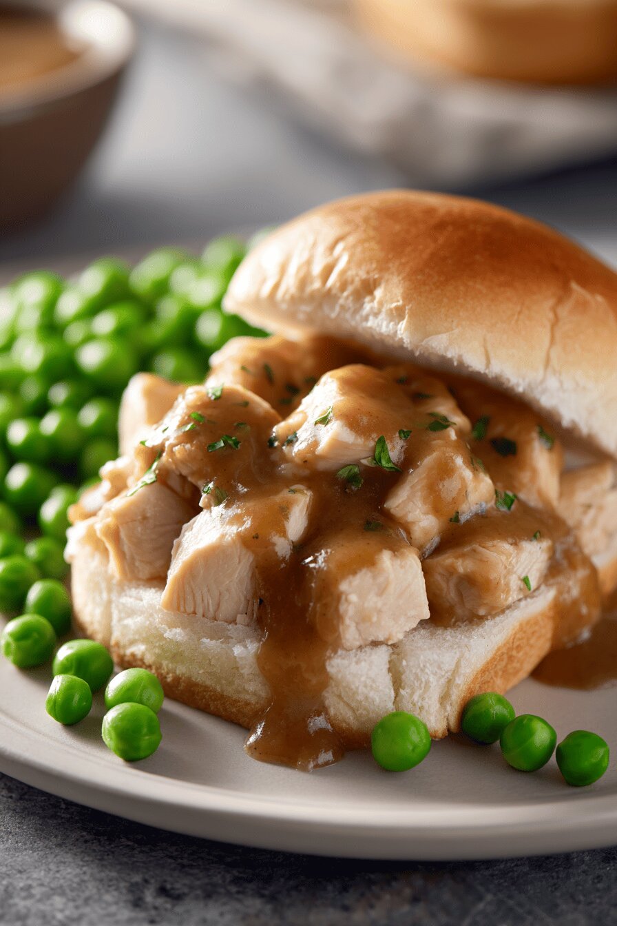 - Place warm diced chicken evenly across bottom halves of buns or bread slices. Spoon generous amounts of hot brown sauce over chicken. Cap with top halves, then spoon more sauce over the bun tops. Spread peas evenly on top.