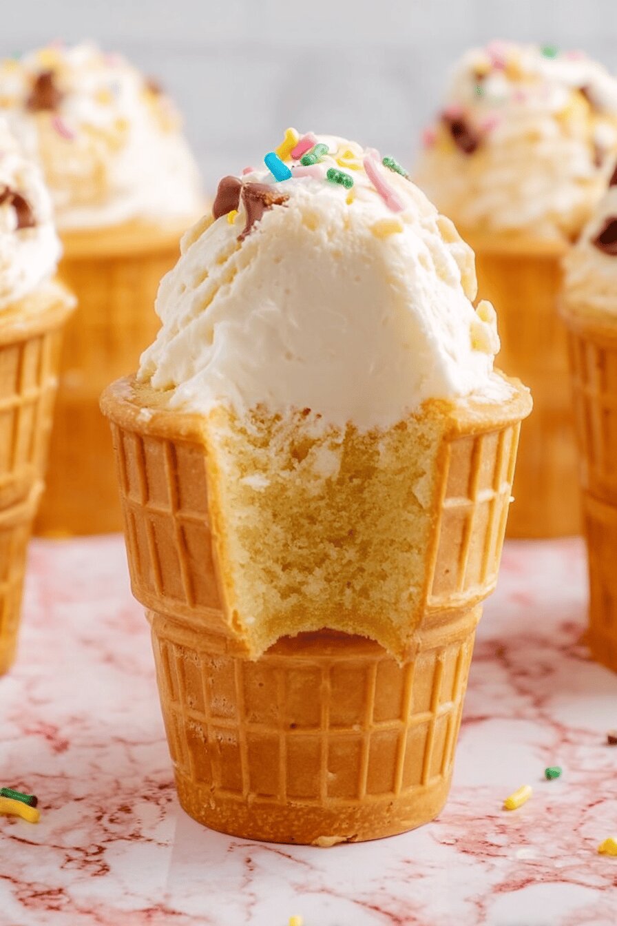 - 💡 Temperature and texture are your guide to doneness. Oven times vary. Watch batter carefully—too shiny means overmixing, tough crumb. Batter thicker gives better rise; pourable but thick. Cooling inside pan keeps cones steady, prevents cracks or flop. Butter soft not melted; too warm or melted butter breaks frosting, greasy texture. Powdered sugar sifted fine helps smooth, no gritty mouthfeel. Vanilla extract optional but boosts aroma nicely. Adding heavy cream during whip adds air, helps pipe shape hold. Frosting stiff at first, gets smoother with beat time. Keep sprinkles ready, top right after piping. Cones flat bottom for stability; sugar cones blacken fast, avoid them. Baking smell, sound cues key; light doming tops, slight crackle cones.