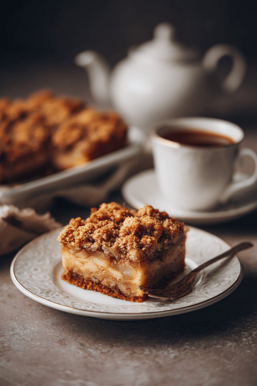 - 💡 Crumble is key contrast — sift flour with cinnamon and sugar, rub in cold butter piece by piece. Warm butter ruins texture, turns greasy. Mix until sandy bunches form. Sprinkle evenly but don’t overload. Thick topping steams inside, sogs cake bottom. Can add oats or almonds for crunch if no allergy risk but keep neat, not clumpy.