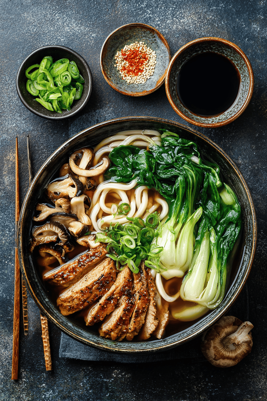 - 💡 Cook mushrooms and greens fast; shiitake flush, bok choy wilts quick. Udon only warms no soak time. Meat cooks several seconds, quick swirl, pink edges appear; meat still soft inside. Don’t wait or pork dries. Chopsticks for meat and veg; simple setup. Broth leftover? Save—base sauces, soups later; waste kills flavor.