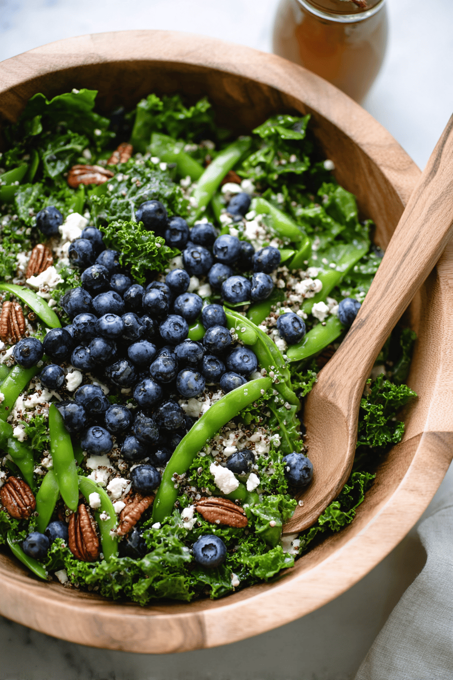 - Add bulgur, blueberries, nuts, snap peas, and feta to kale bowl. Toss gently with remaining dressing. Taste for seasoning; adjust salt and pepper. Serve immediately or chill briefly. Keeps well, but best fresh to avoid sogginess.