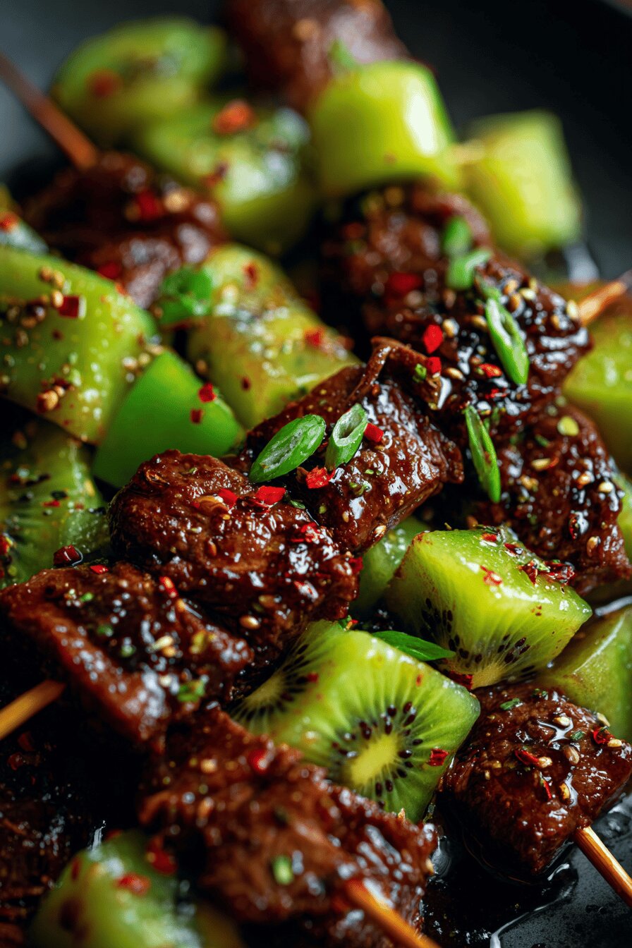 Beef strips marinated briefly in a tangy kiwi-soy blend. Grilled hot and fast. Served with fresh kiwi cubes tossed in olive oil. Uses mirin and a hint of chili paste for a subtle kick. The kiwi’s enzymes tenderize meat quickly. Eight skewers ready in under 30 minutes total. No dairy, nuts, or eggs. Balanced sweet, salty, spicy, and fresh. Summer BBQ-friendly. Asian-inspired flavors with a fresh twist.