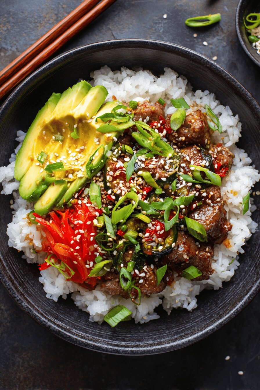 - Divide rice evenly into four bowls. Spoon pork over rice, including any juices, glossy coating important. Neatly pile pickled carrots and cucumbers to one side for contrast. Add avocado slices around edge or on top for creaminess that cools heat. Sprinkle with sliced green onions and toasted sesame seeds liberally. Serve immediately. The pork juices soak rice, blending savory heat with cool, tangy fresh crunch and buttery avocado.