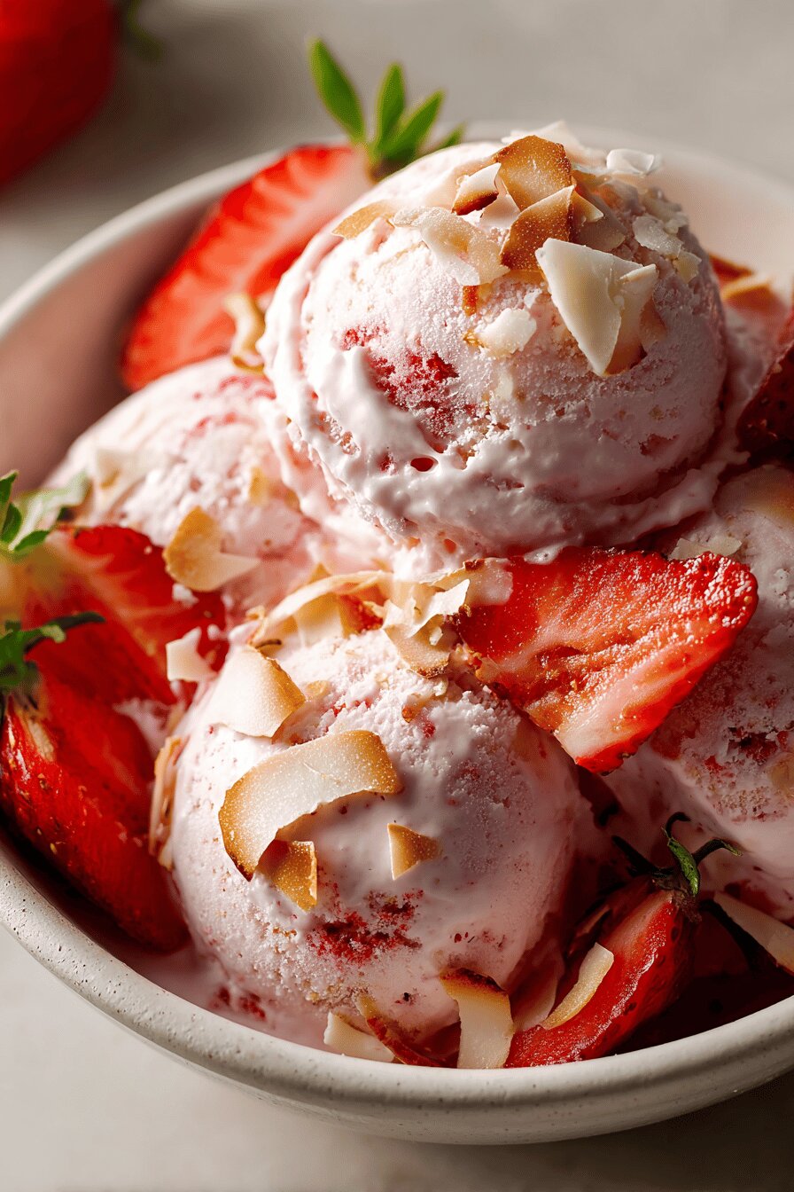 Maceration extended to twenty minutes—older macerations deepen fruit flavor and juice extraction. Heat custard mix until just thickened, constant stirring avoids lumps and burning—fine control prevents cooked eggs. Whip whites carefully adding syrup slowly prevents grainy meringue, forms stable peaks. Folding steps crucial: air must remain trapped for light finish, so stirring is gentle yet thorough. Incorporate diced strawberries with juices at this stage to keep texture intact without breaking up. Coconut cream whipped just before folding avoids melting or deflating. Toasted coconut flakes folded last prevent sogginess, add crunch. 6 to 10-hour freezer time strikes balance: softer ice crystals. Halfway stirring optional but recommended to keep creaminess. Remove before serving to soften edges for easier scooping and fuller flavor release.