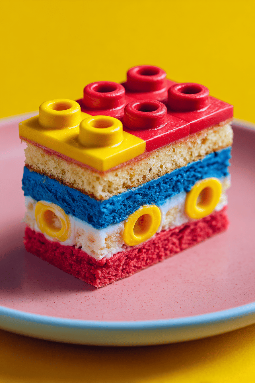 Yielding 14 to 16 portions, this layered cake relies on classic all-purpose flour replaced partially by cake flour for a lighter crumb. Baking powder softened to baking soda, quick fixes for rise and texture. Vanilla switched to almond extract, bringing unexpected warmth. Butter swapped for half margarine, easier handling in humid kitchens. Steps shuffled; baking times nudged 35 to 48 minutes. Three rectangular pans shape the cake blocks. Frosting splits into three colors—red, blue, yellow—gel dyes for vibrant Lego tone. Circles cut, thicker strip left for stamping. Cake assembly mimics Lego bricks stacked at angles on board. Texture and timing cues stressed over exact minutes. Practical tips on ingredient swaps and frosting fixes included.
