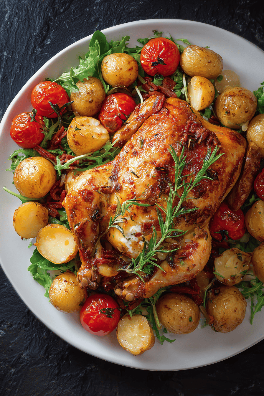 - Remove pan, tilt slightly to gather pan juices. Spoon over bird, potatoes, and tomatoes. Let rest at least 10 minutes before carving — keeps juices in meat, allows flavors to settle. Serve with sharp green salad as counterpoint.