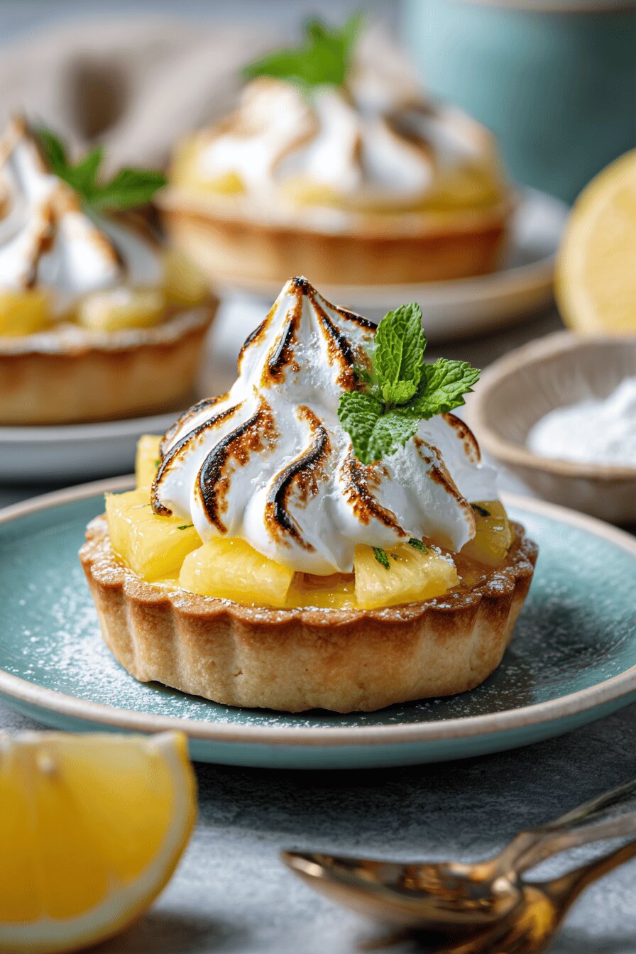 - Arrange thin pineapple slices atop each tartlet gently. Reserve lemon zest strips for garnish.