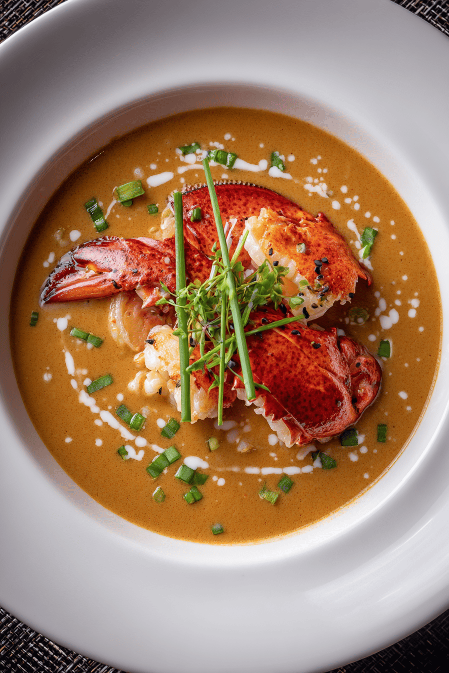 A delicate seafood broth with a hint of white chocolate, blended with striped bass and lobster meat. The chocolate melts into the fumet creating a creamy texture without cream. Egg yolk thickens gently. The soup is finished with tender fish cubes and sweet lobster chunks. Pinches of green onion add brightness. Cooking low and slow keeps the fish firm and juicy. No nuts, gluten free, subtle sweetness meets briny richness. Lobster claws split for garnish, visual punch. Originally fish fumet, chocolate white replaced partly by white cocoa butter for softer sweetness and less dairy tone. Egg yolk swapped partly to mascarpone for silkier mouthfeel. 4 portions.