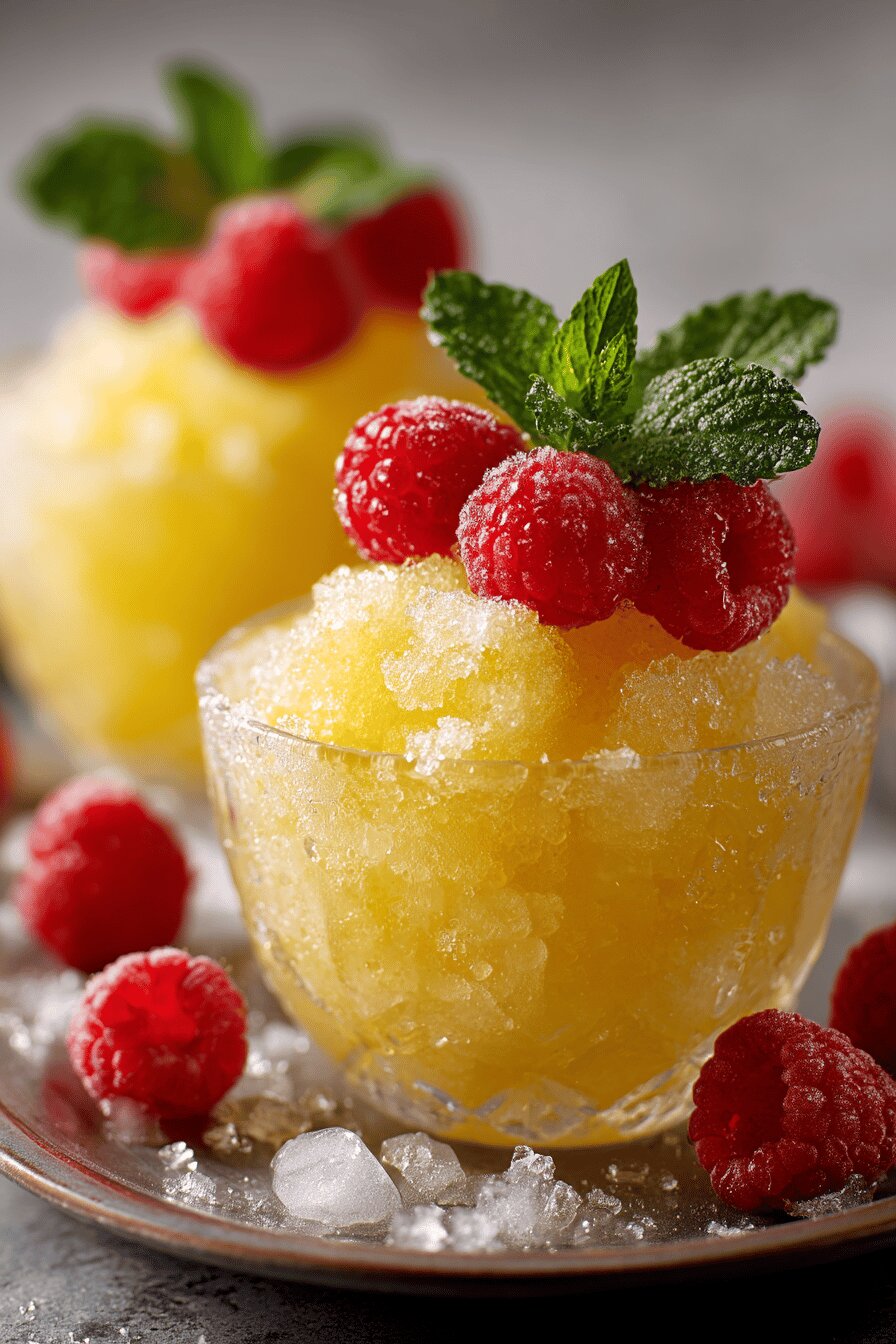- Spoon granita into chilled cups. Garnish with fresh mint and scattered raspberries. Serve immediately.