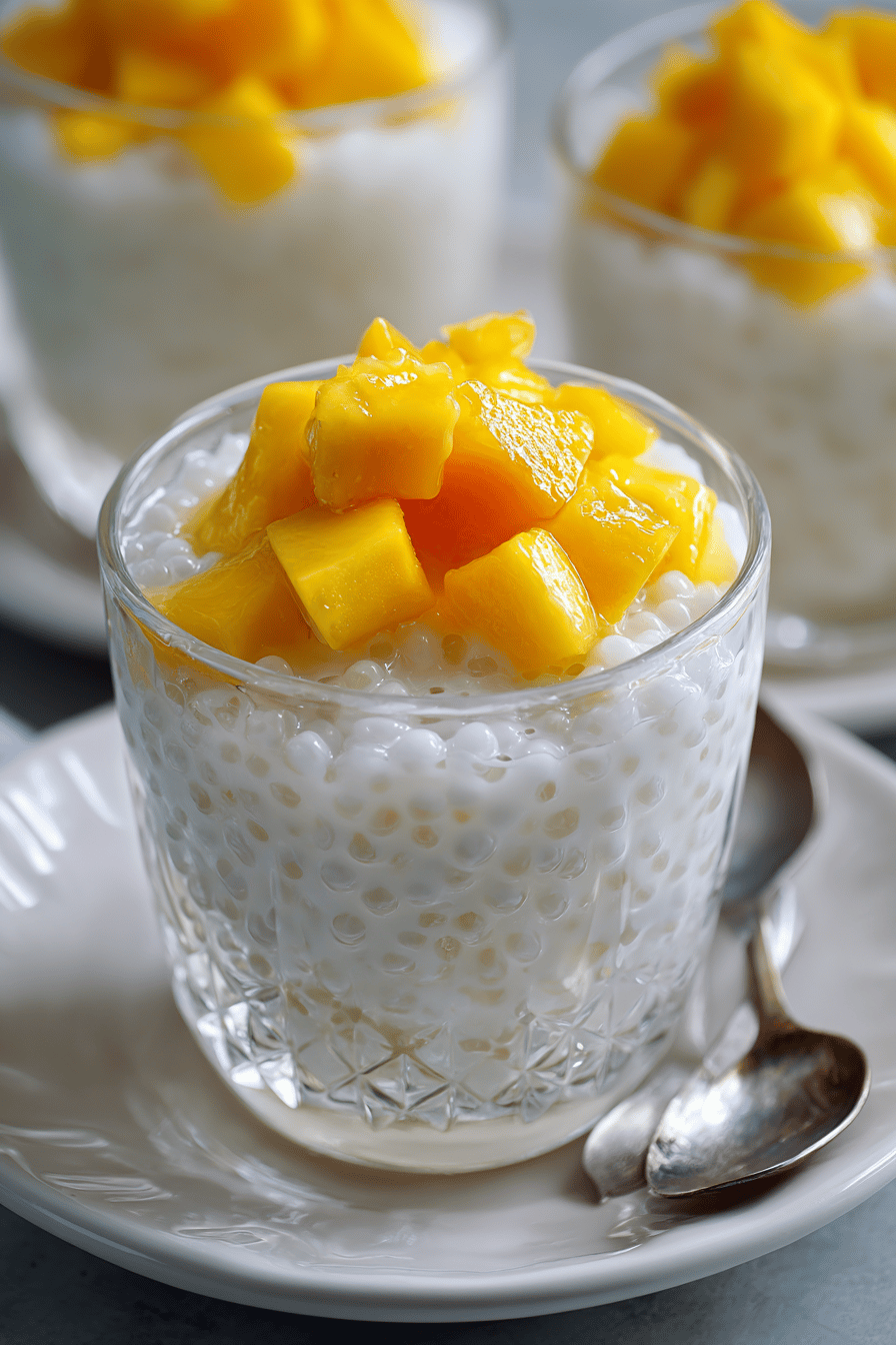 Coconut milk simmered with tapioca pearls, sweetened lightly, then chilled until set. Fresh diced mango added atop fine crushed ice. A drizzle of condensed milk finishes it off. A fruity, creamy chill treat with chewy tapioca bites. No nuts, gluten, or eggs involved. Subtle sweetness balanced by mango freshness. Coconut and mango married with crushed ice for a textural contrast that’s refreshing and soft. Tapioca pearls cooked until translucent, stirred to loosen before layering onto ice. Condensed milk drizzle optional but adds a sweet creaminess that suits the coolness perfectly.