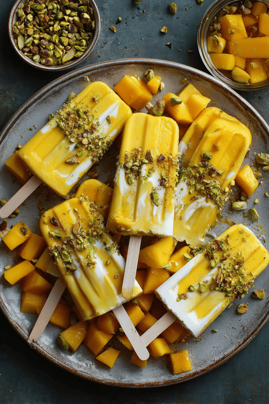 - 💡 Watch mango mix thicken as chills. Pistachios darken slightly frost but keep crunch. Smell mango, faint cardamom if used. Texture cues better than clock. Pops stick placement affects freezing – uneven sticks mean weird shape or freezing. Always taste raw mix to adjust sweet/sour before freezing. Never skip tasting.