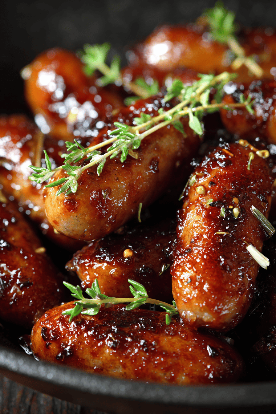 - 💡 Use fresh thyme at end. No cooking herbs to keep fresh flavor pop. To save time, glaze prep can be done while oven preheats. Baking first not too long just warm sausages and activate glaze sugars. Keep an eye on bubbling glaze; too high browning risks bitterness, too low no caramel. Glaze bubbles signal sugars melting. Clean tray right after use to prevent smoke and burnt residue next use. Use allergen-free sausages if needed; label check critical for gluten free. Store leftovers cooled loosely covered; reheat gently to keep glaze.