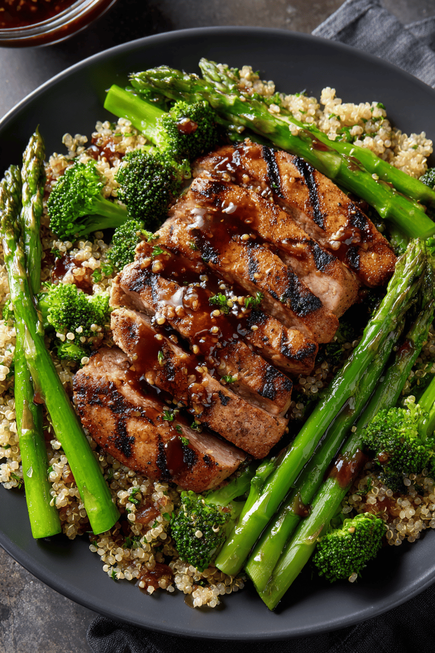 - Plate quinoa mix, nestle pork chops on top. Spoon glaze generously over meat. Serve immediately to savor shiny sticky sauce and hot tender meat against fluffy verdant quinoa.