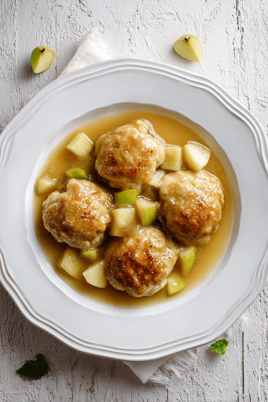 Dry sifted mix avoids lumps for consistent dough. Stir carefully but thoroughly; overmix toughens dough but undermixing leaves clumps. Wet hands critical for shaping; dough sticks like glue, patience essential. Encase apples fully to avoid leakage during simmer — dough seals prevent syrup dilution and floppy dumplings. Simmer syrup with cinnamon stick and lemon juice for bright, spicy notes, not just maple sweetness. Watch for bubbled amber syrup not just high heat; too hot boils syrup too fast, dumplings cook unevenly. Dumplings done when gently pressed skin feels springy back but not raw. Removing with slotted spoon avoids syrup loss. Serve immediately as texture changes on cooling; dumplings get soggy and syrup thickens, losing delicate balance.