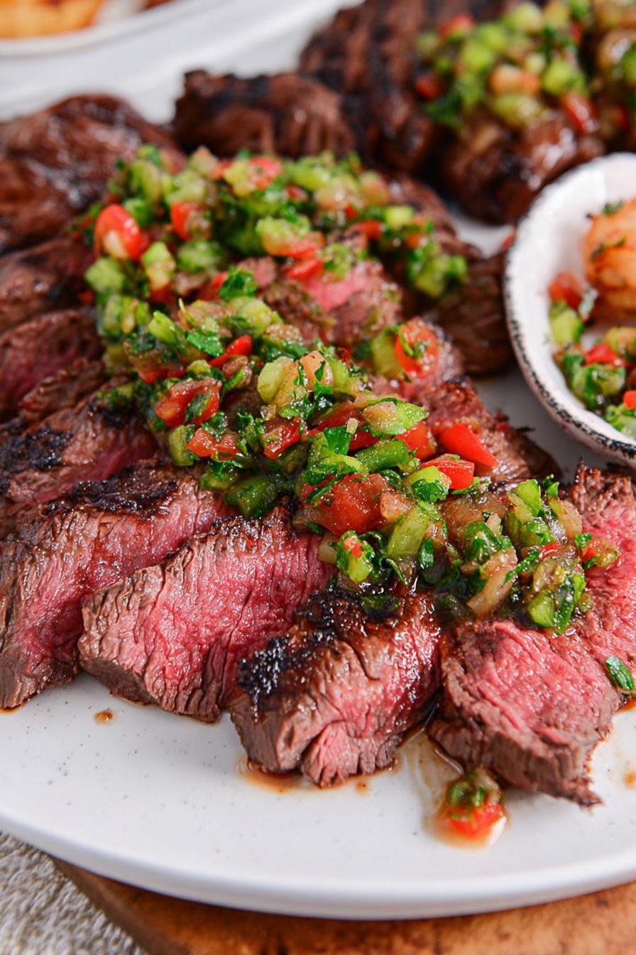 - Arrange sliced steak on platter. Spoon chimichurri style sauce liberally over top or serve on side. Perfect for steak sandwiches or over steamed rice. Watch for carryover resting where the juicy red hues deepen into tender brown edge finish. On reheating, favor gentle heat to keep tenderness.