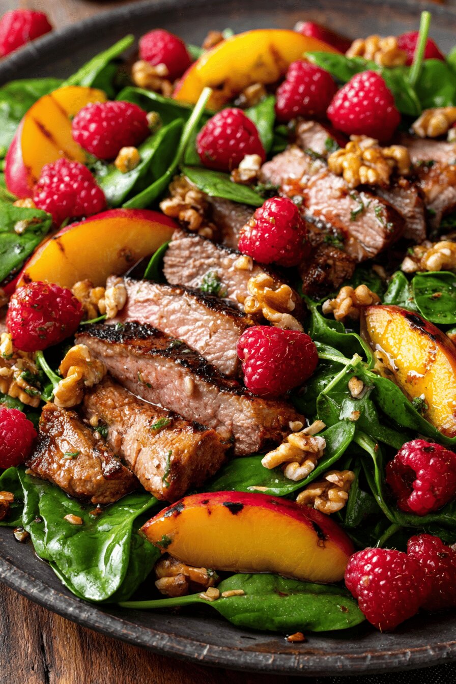 - 💡 Assemble last second to keep spinach leaves bright, crisp. Dressing on leaves slowly wilts. Spinach soaking in vinaigrette too long becomes limp, loses structural snap. Timing from grill off to serving less than 10 min max. Black pepper last touch. Salad cold but pork still tender-warm; warm protein over cold greens gives balance. Juices resting in meat hit ripe fruit, nuts. Complex mouthfeel from textural play.