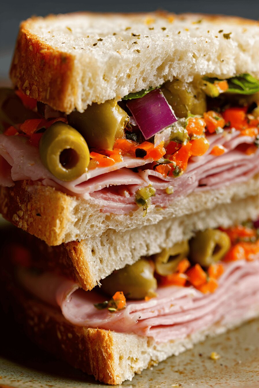 Savory, bold, and in layers. Muffuletta sandwiches got meats. They got cheeses too. And olive salad, lots of it. A journey of tastes. Heaps of ingredients fill this one. Italian bread makes it sturdy. Nice for sharing or a solo meal. Built with favorites. Turkey, mortadella, and capicola all stack up. Cheeses melt into that mix. Tangy olives add a kick. A fast bake brings it together. Serve warm. Cut neatly for party style. Very rich but still good.