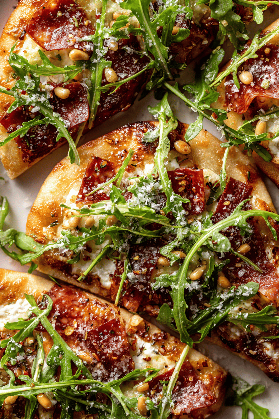 Flatbread sandwiches baked on hot stone. Parmesan oil dressed dough folded. Ricotta, chopped pine nuts swapped for pistachios. Lemon zest brightens. Mortadella replaced by spicy soppressata. Arugula holds the peppery green spot. Quick 3 to 4 minute bake with rotations for even color. Garlic, rosemary, chili flakes in olive oil with fine Parmesan grated in for punch. Rustic, handheld, layered flavors with a touch of heat and crunch.