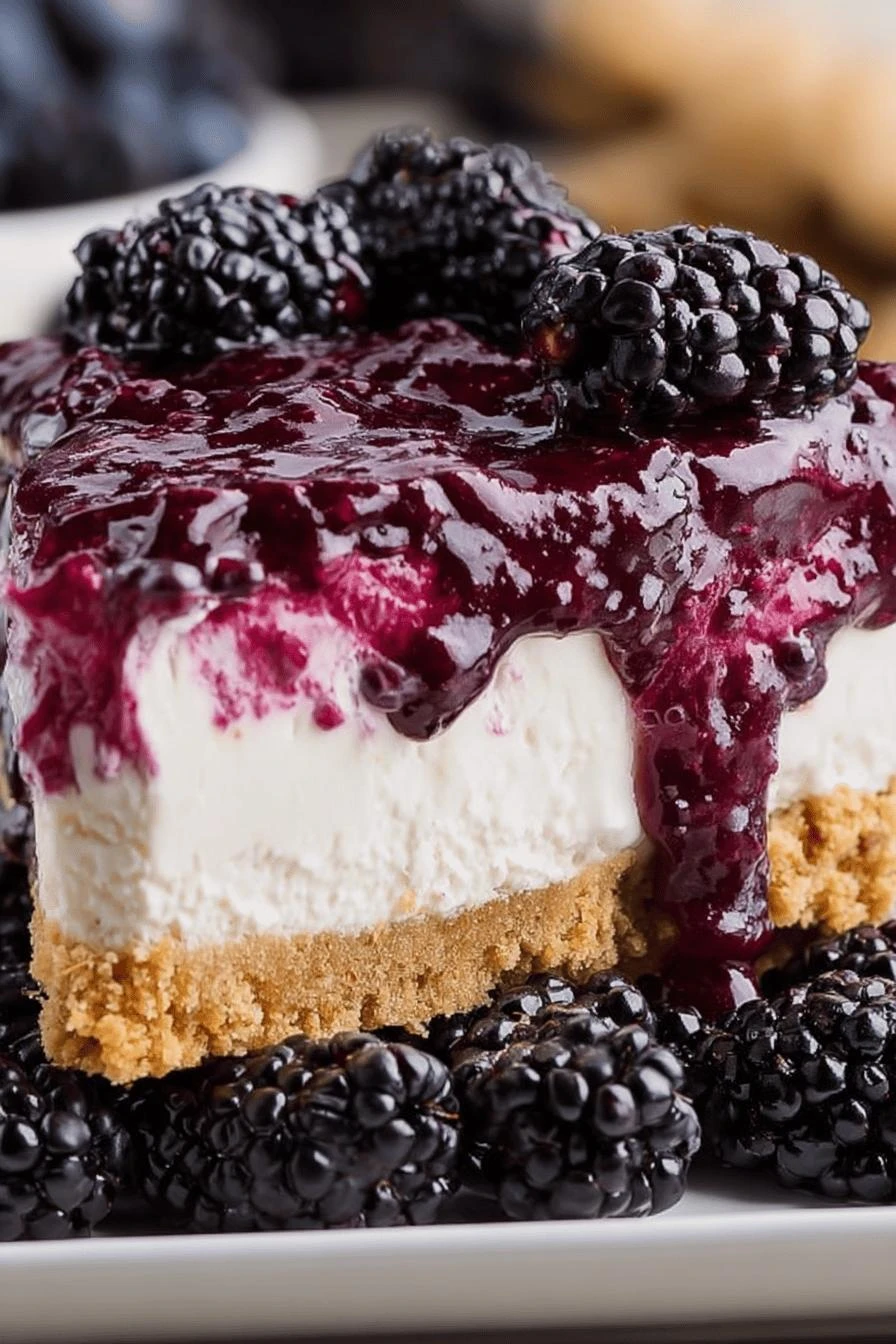 Doesn’t need an oven. Just a fridge and 22 minutes of your time while you do other things. Tastes homemade but smoother than most baked versions—Greek yogurt keeps it lighter, less dense. The blackberries cook down into this thick, glossy jam that tastes nothing like canned filling. Freezes beautifully. Pull it straight from the freezer and slice cold, or thaw slightly for creamy bites. No bake means no kitchen heat. Perfect for summer or when you can’t stand turning on the oven.