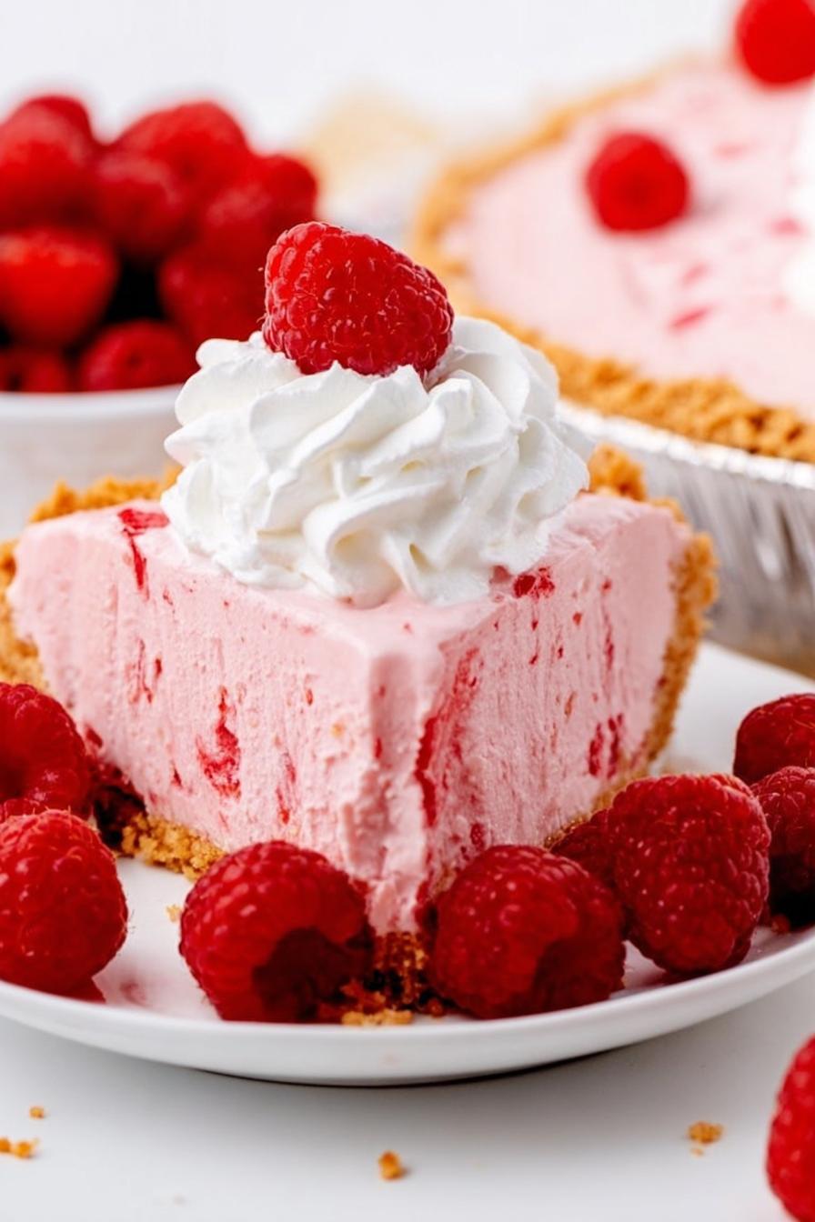 Dissolving raspberry gelatin in boiling water first ensures no graininess. Whisk until it gleams and visible powder vanishes. The bloom of unflavored gelatin in cold water is crucial; no skipping or rushing — swollen gelatin wakes up and holds structure when cold. Mixing the two gelatins immediately prevents clumping or lumps in filling. Crushed ice cools but also slightly dilutes gelatin to just right consistency. Be patient stirring until ice fully melts — visual clarity changes when ready, the finish looks syrupy, not cloudy or watery. Whipped topping fold is all about gentle lifts and turns, not vigorous stirring. Toss berries in gently; torn raspberries turn pink the mix and ruin the uniform look. Spreading half the berries below filling protects crust from sogginess and adds surprise bursts. Chill loosely covered; tight seal traps condensation and sogginess, loose cover keeps surface firm but fresh. Garnish piping tip choice impacts creaminess look — large star tip for vintage swirl, round tip for dots or rosettes. Chill after decorating stabilizes shape for clean slices.