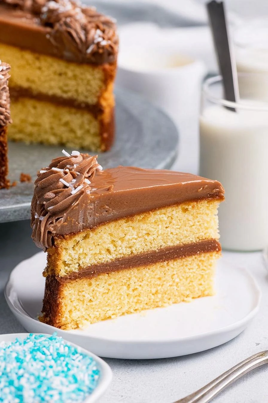 - 17 Frost cake all over with chocolate buttercream (control thickness for neater slices). Final dusting of powdered sugar adds visual contrast and slight sweetness.