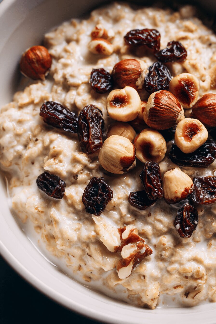 Oats. Creamy. Thick but still loose. Cardamom swaps cinnamon. Raisins add chewy bursts. Rolled oats give more texture than ground—bite, not just mush. Maple syrup and dates layer sweetness but keep it natural. No dairy here. Water quantity trimmed down. More body, less liquid. Quick simmer—no long wait. Rest time included though. Nuts are hazelnuts now, earthy and mild but riskier for allergies. Can skip them if needed. Rustic feel but simple. Breakfast, brunch, whenever really. Eat it straight from the pot or topped, whatever mood hits. Nut-free or gluten options easy. No fuss, just good ingredients doing their thing.