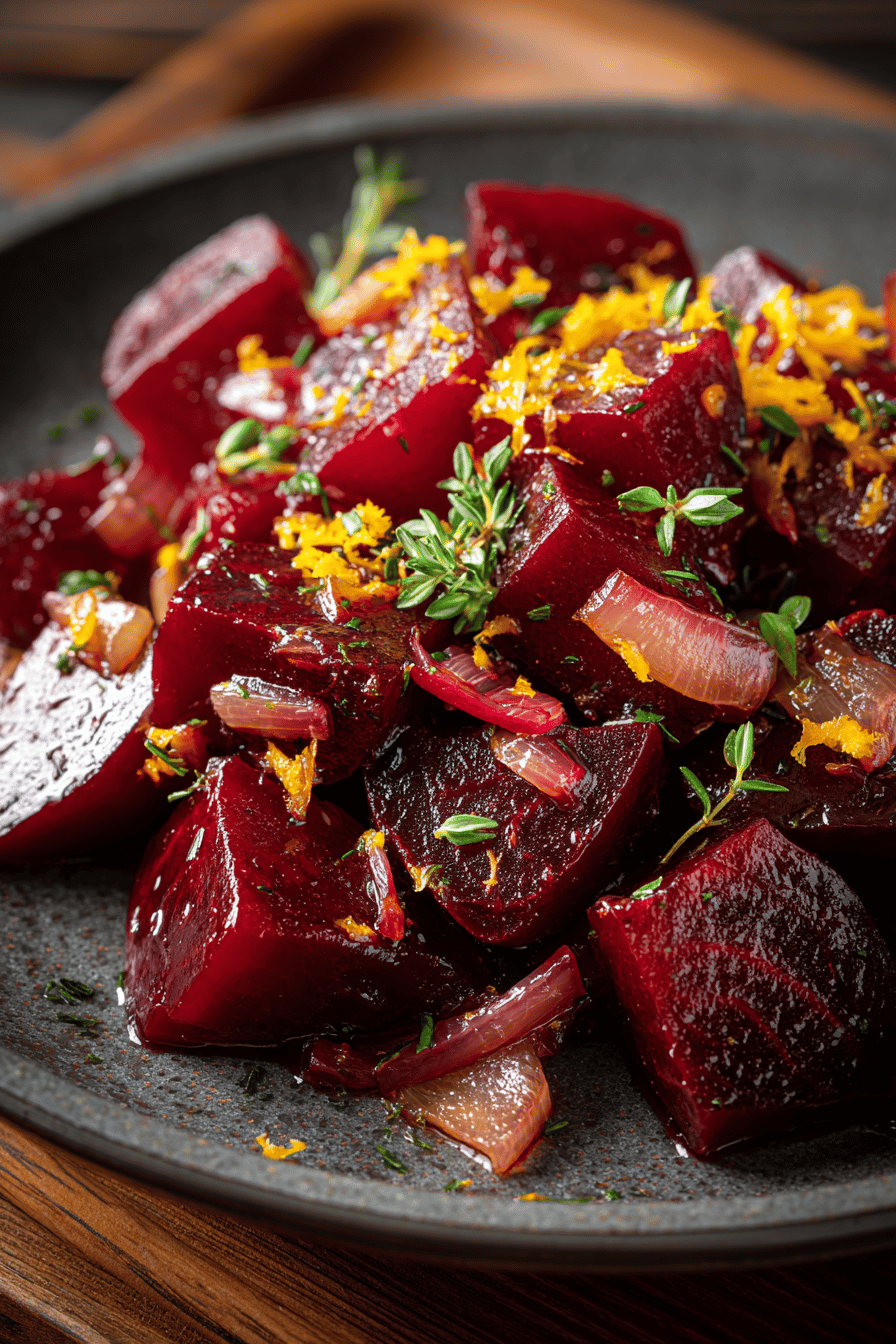 - 💡 Orange juice simmers down to syrupy sheen. Bubbles slowing, edges light caramel color. Not sticky solid but thickened. Pouring thick ribbon coats. Pour beets in when this stage hits. Syrup clings to cubes for even brightness, not drowning or watery pooling.