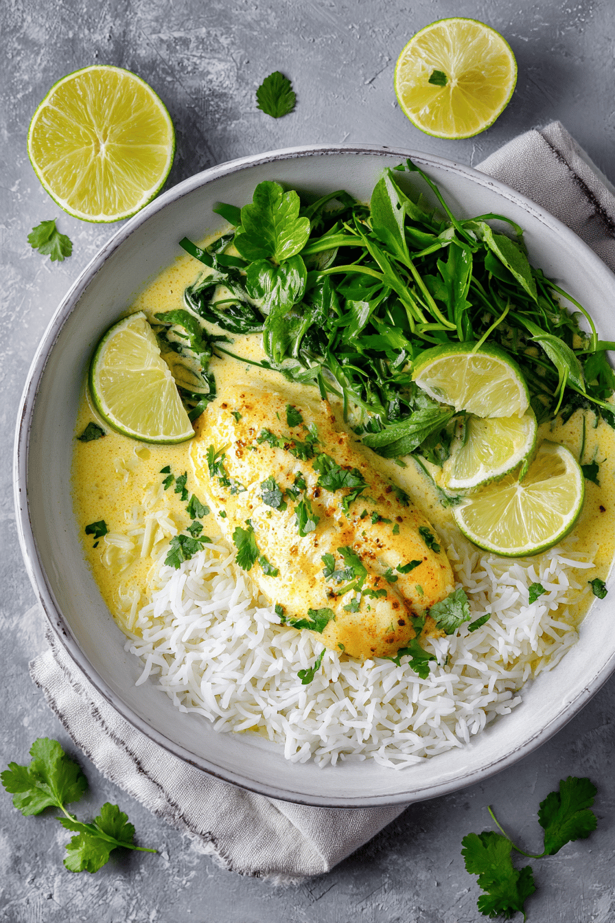 Start heating coconut milk first to bloom aromatics like lemongrass and turmeric —this releases essential oils and builds depth. Avoid a hard boil; you want gentle simmer that ruffles surface, tells you sauce is warming without curdling. Add fish and cover promptly to trap steam; it cooks fish evenly, holds moisture. Check fish doneness by gentling poking with fork, looks opaque but still moist, flakes easily. Overcooked fish flakes too much, becomes mealy. If sauce too thin at end, remove lid, medium heat for few mins thickens it through evaporation. Add lime juice last —heat can dull that fresh acidity. Taste before final seasoning; sometimes a pinch more salt or lime juice balances flavors. Don’t rush or stir too vigorously, fish chunks may fall apart. Serve immediately; sauce tends to thicken and set upon cooling. Leftovers reheat gently, adding splash of coconut milk to loosen sauce. For quicker prep, swap lemongrass with ground lemongrass powder but fresh is superior.