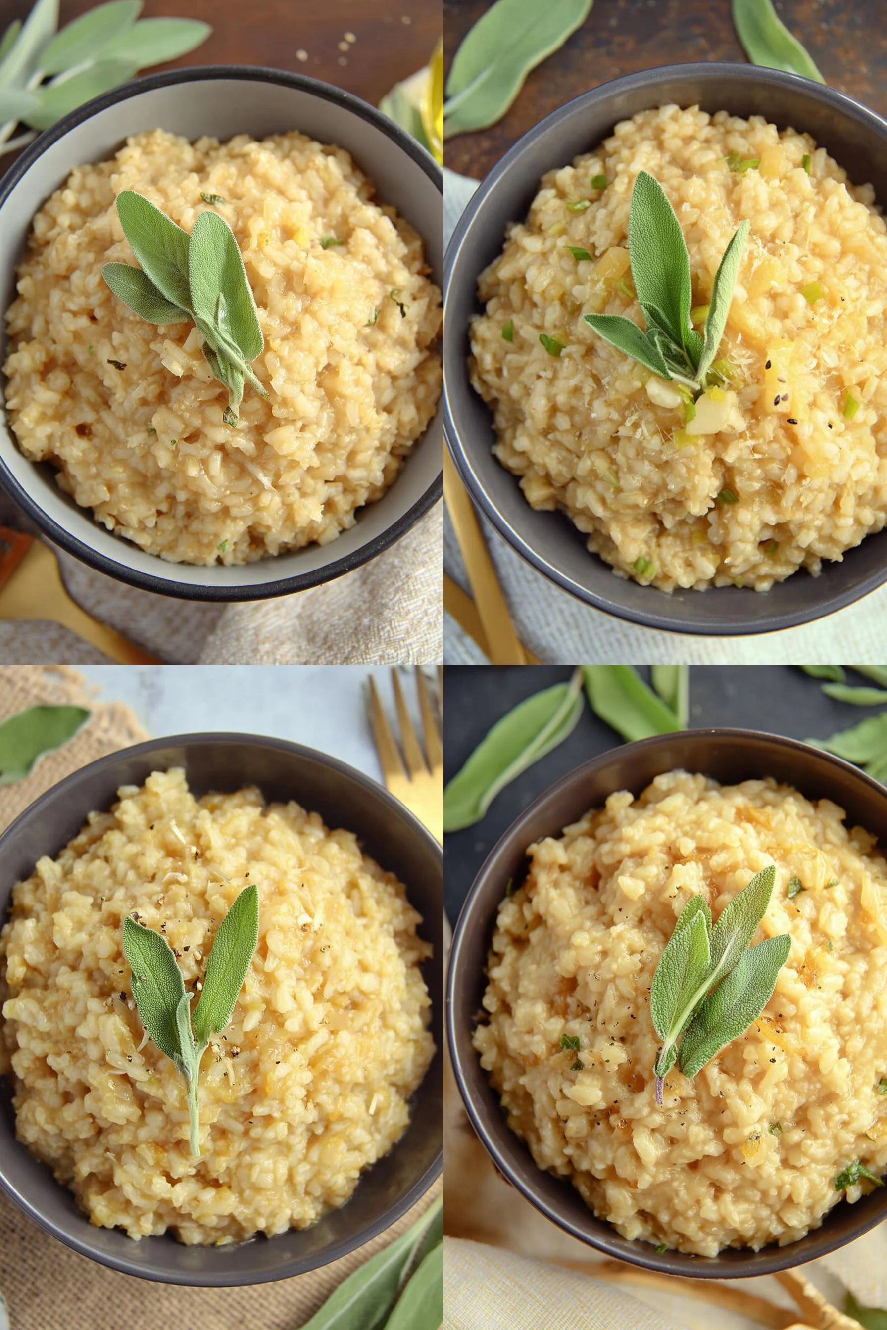 - 8 Serve immediately. Garnish with extra Parmesan or a few sage leaves if you want green pop. Risk of reheating is gritty texture due to rice starch crystallization, so best fresh.