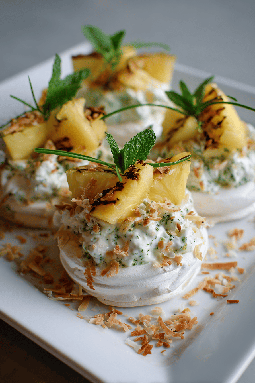 - 💡 Assemble close to serving. Meringues absorb moisture fast. Basil cream whip last moment, pipe fast or will deflate/lose air. Pineapple diced small enough to fit well but keep bite. Toast coconut to golden, watch quick burn.