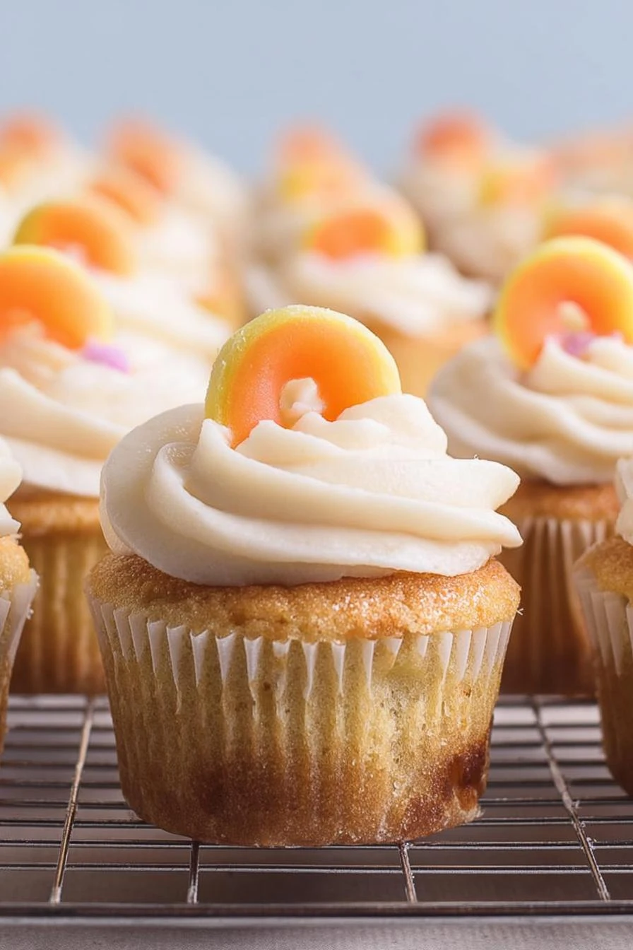 - 9 Fill piping bag with favorite tip—round or star. Crown cupcakes generously. Peach rings (or fresh peach slices) press atop as visual cue and for bite contrast.
