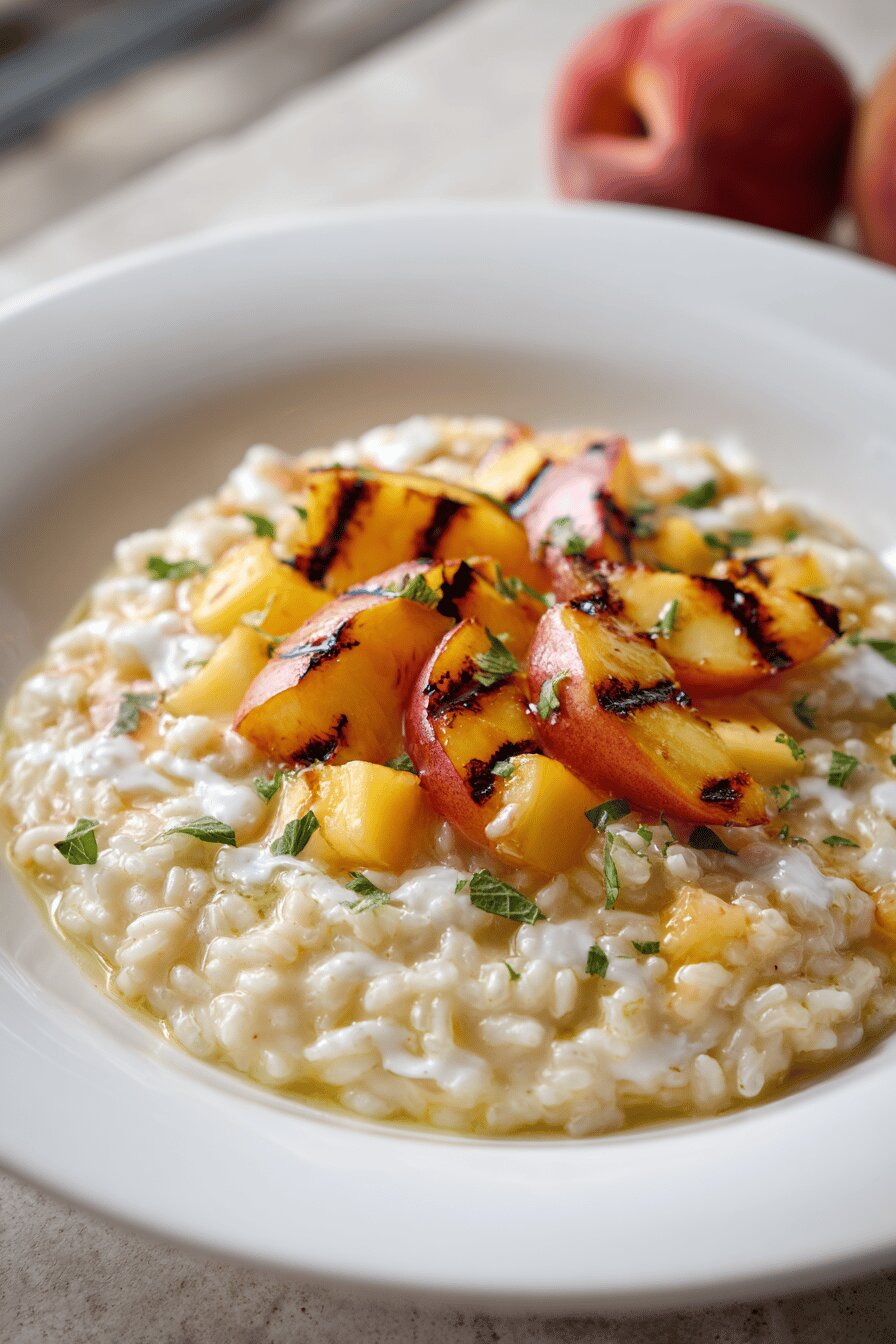 - While risotto rests, fire up grill to medium or heat a lightly oiled ridged pan. Place peach halves cut-side down. Grill 7–12 minutes, watching for caramelized edges and tender flesh. The fruit juices start bubbling around edges; that’s your signal.